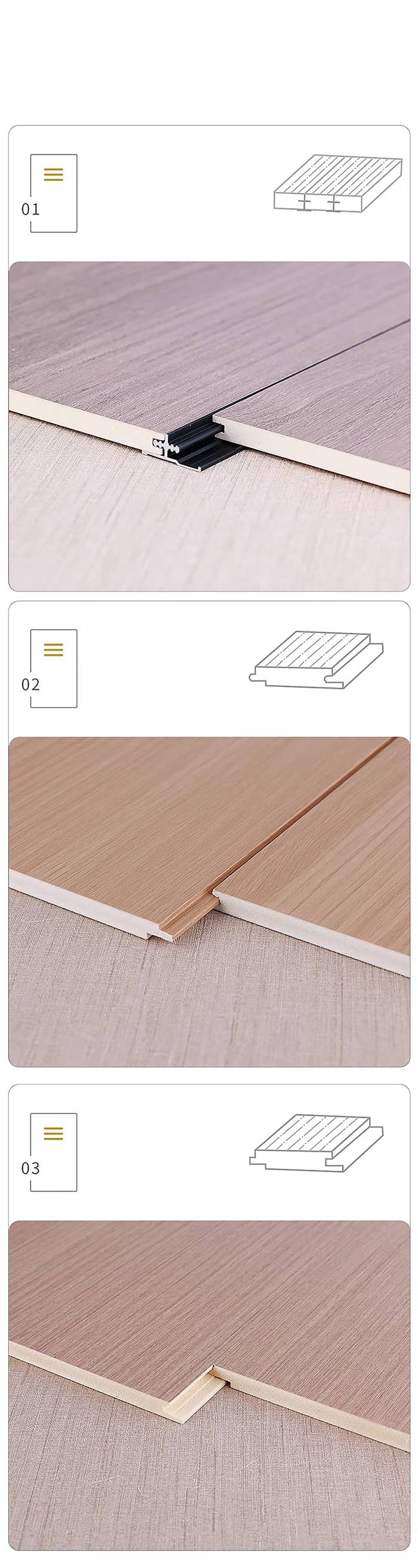 (3) Byggeproces Vægbehandling: Nivellering er påkrævet, og trækøle eller direkte limning kan anvendes til montering. Splejsningsmetode: Brug mor-og-barn-riller og metallukningslister til sømløs splejsning. Lukkebehandling: De indvendige og udvendige hjørner kan være buede eller profillukkelister kan bruges til at optimere æstetikken8.